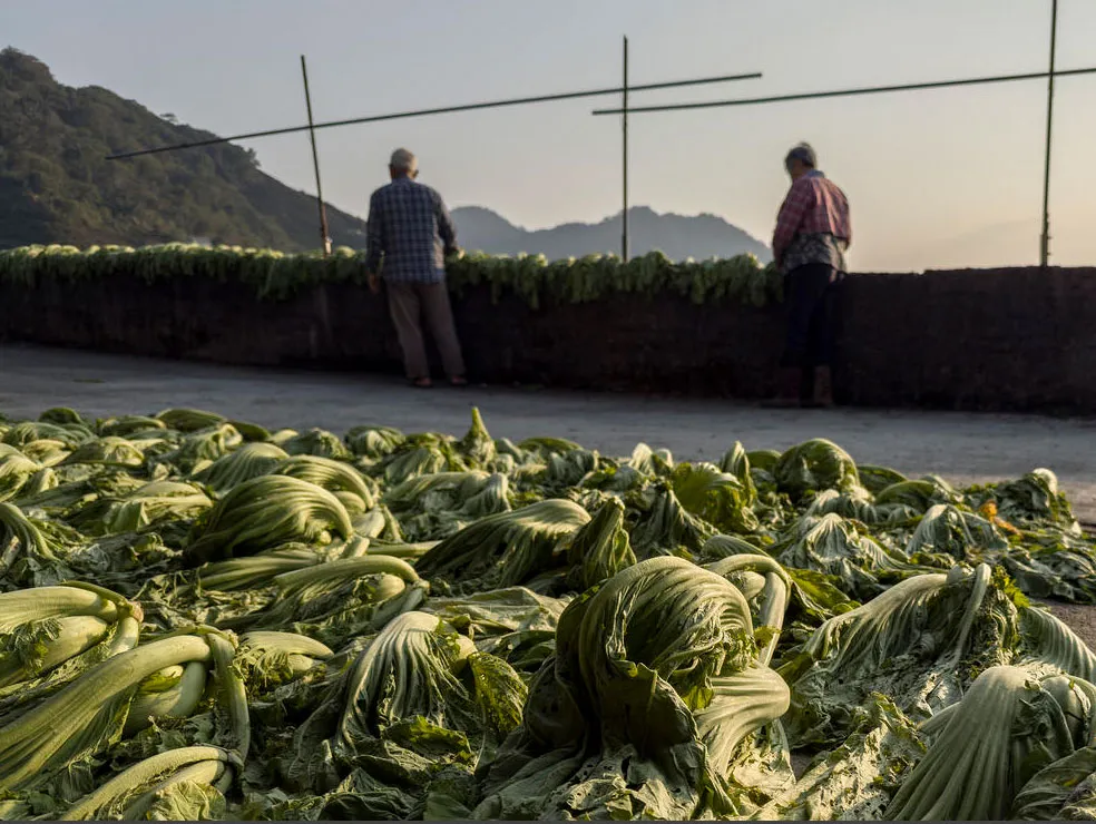برگ‌های بلند خردل در حال خشک شدن زیر نور آفتاب، در منطقه‌ای کوهستانی در تایوان/ زوما