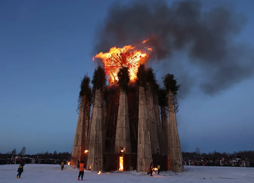 آتش زدن سازه‌ای 25 متری در طول جشن سنتی اسلاوهای روسیه که به مناسبت پایان زمستان برگزار می‌شود./ گتی ایمجز